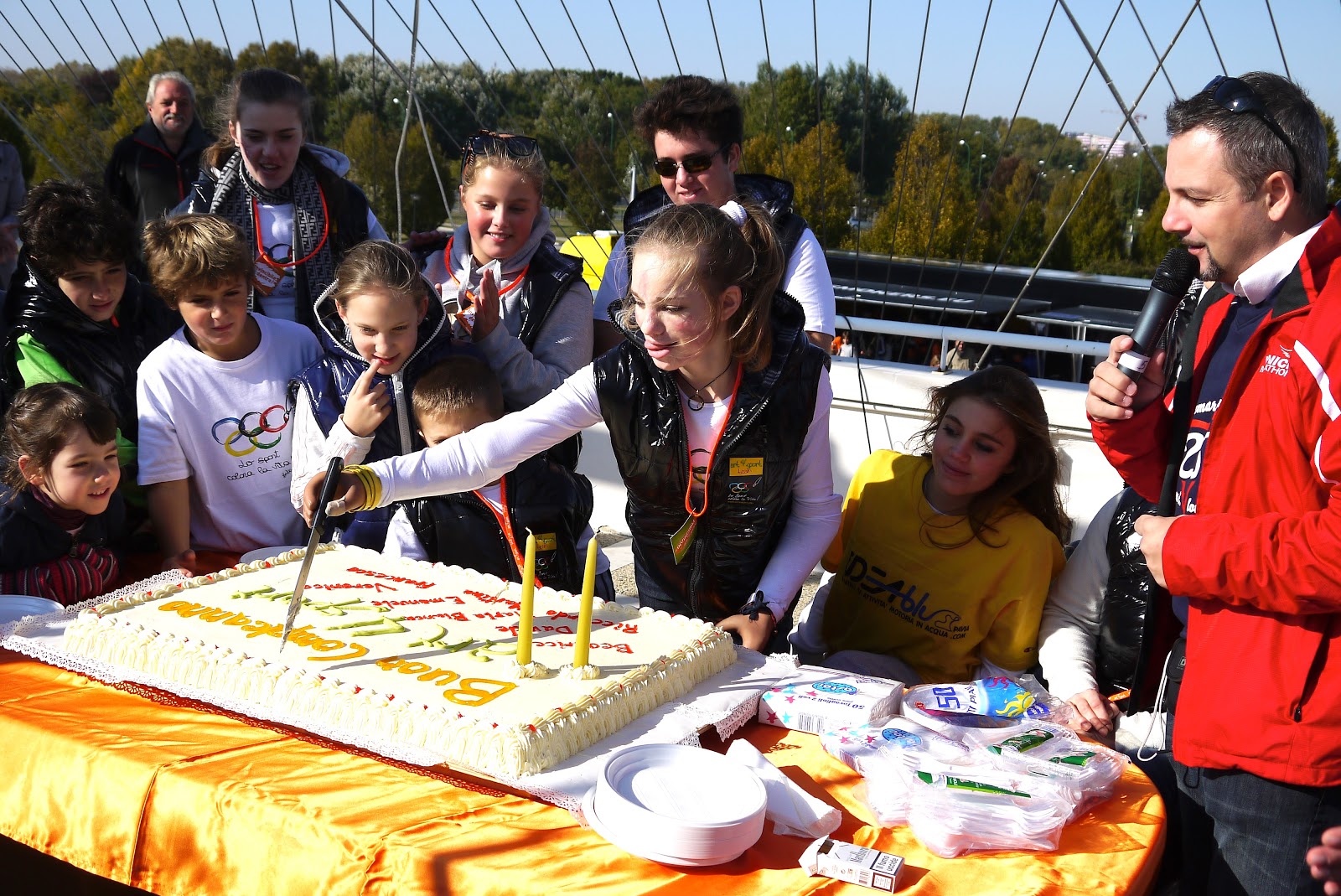 La mega torta è stata tagliata da Bebe con la famiglia Vio e tutti i volontari a testa bassa nell' accoglienza, nell'informare in merito alle iniziative di Art4Sport e a vendere la magliette disegnata da Bebe (in posa con la Marghe) con il motto "lo sport colora la vita".