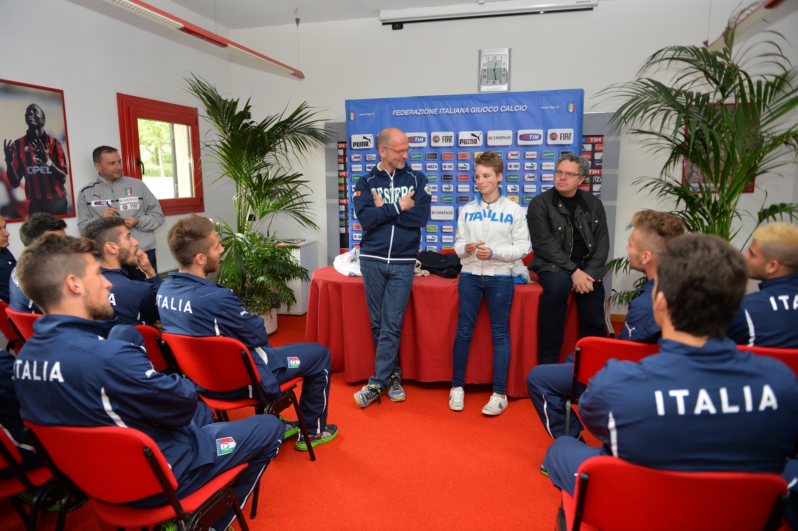 "In un mondo molto particolare come quello del calcio vi ho detto più volte che vi considero ragazzi speciali - ha datto Mangia ai suoi azzurri - quindi oggi vorrei farvi conoscere una persona molto speciale alla quale, tra l'altro, possiamo anche chiedere qualche segreto per essere dei vincenti. Ha solo sedici anni ed è reduce da due vittorie nelle ultime due gare di coppa del mondo di scherma paralimpica. Vieni Bebe!"
